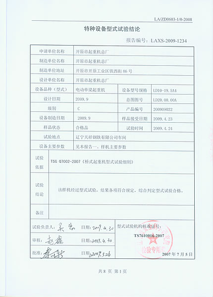 特種設(shè)備型式試驗報告(結(jié)論)