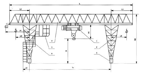 1、葫蘆起升機(jī)構(gòu) 2、支腿 3、大車運行機(jī)構(gòu) 4、主梁 5、司機(jī)室 6、梯子、平臺欄桿安裝